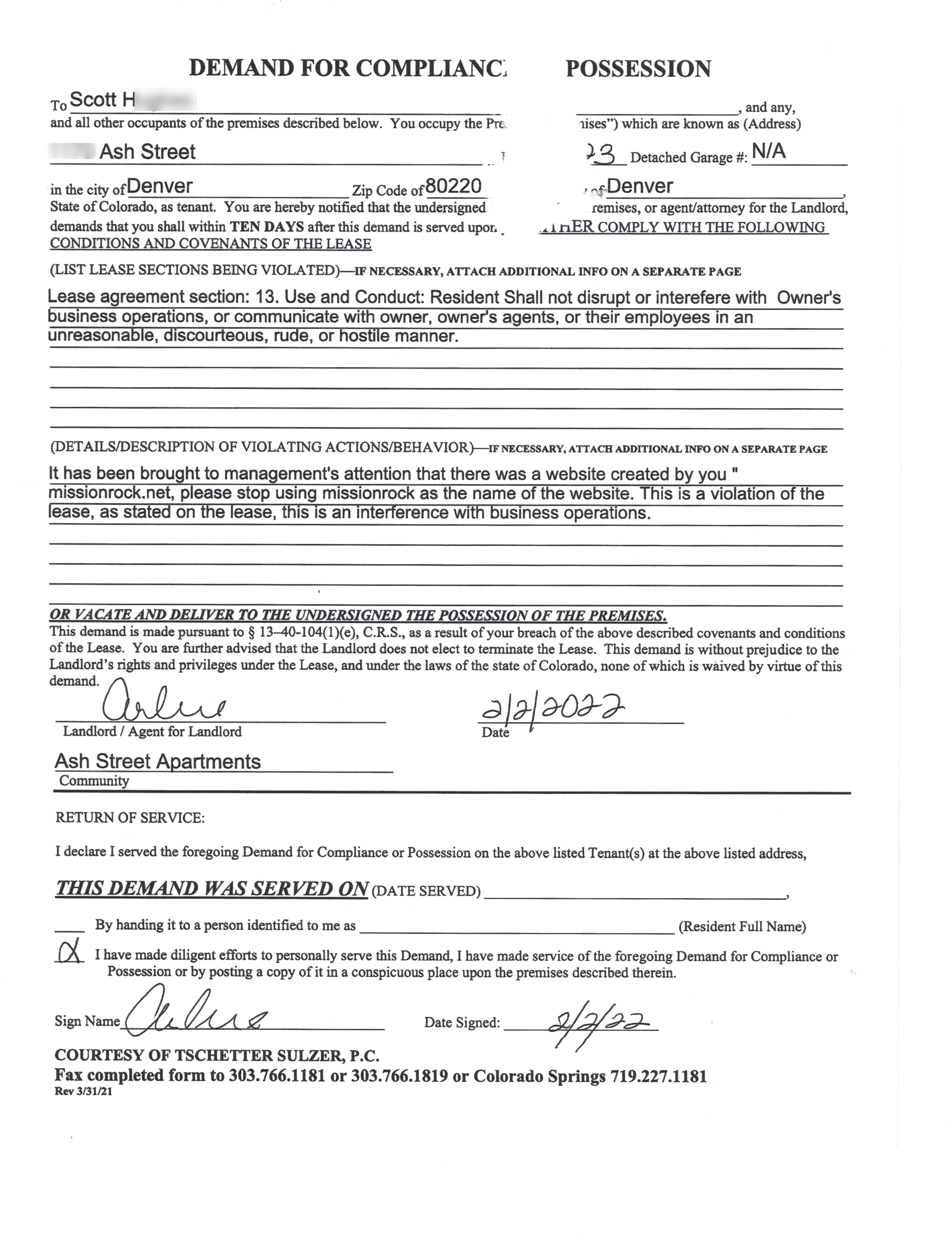 I updated this presentation to include the "Demand for Compliance or Possession" notice that was posted on my door in Feburary of 2022 after I had informed the management of the existence of this website. I assumed at the time that the managers would take the situation seriously and abide by their ethics and repair the door opener (or address the fact that they weren't and provide some legitimate reasoning) but they did nothing. I was intimidated by them so I took this website offline until after I was able to move. It was demeaning too since during the whole time that the door opener was broken the maintenance would do other routine "business as usual" rounds ... including changing the flappers on the toilet tanks and that took a crew of three people entering my apartment to accomplish. They had also went around and changed all of the apartments' locks when Mission Rock Residential took over and all the while the management was violating ADA law.