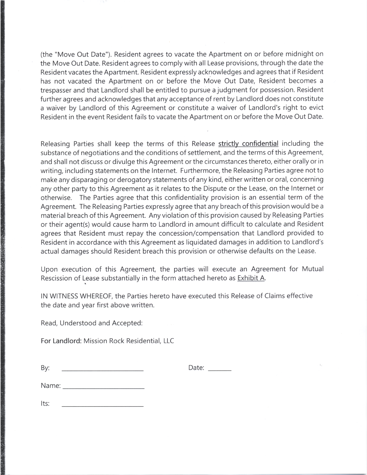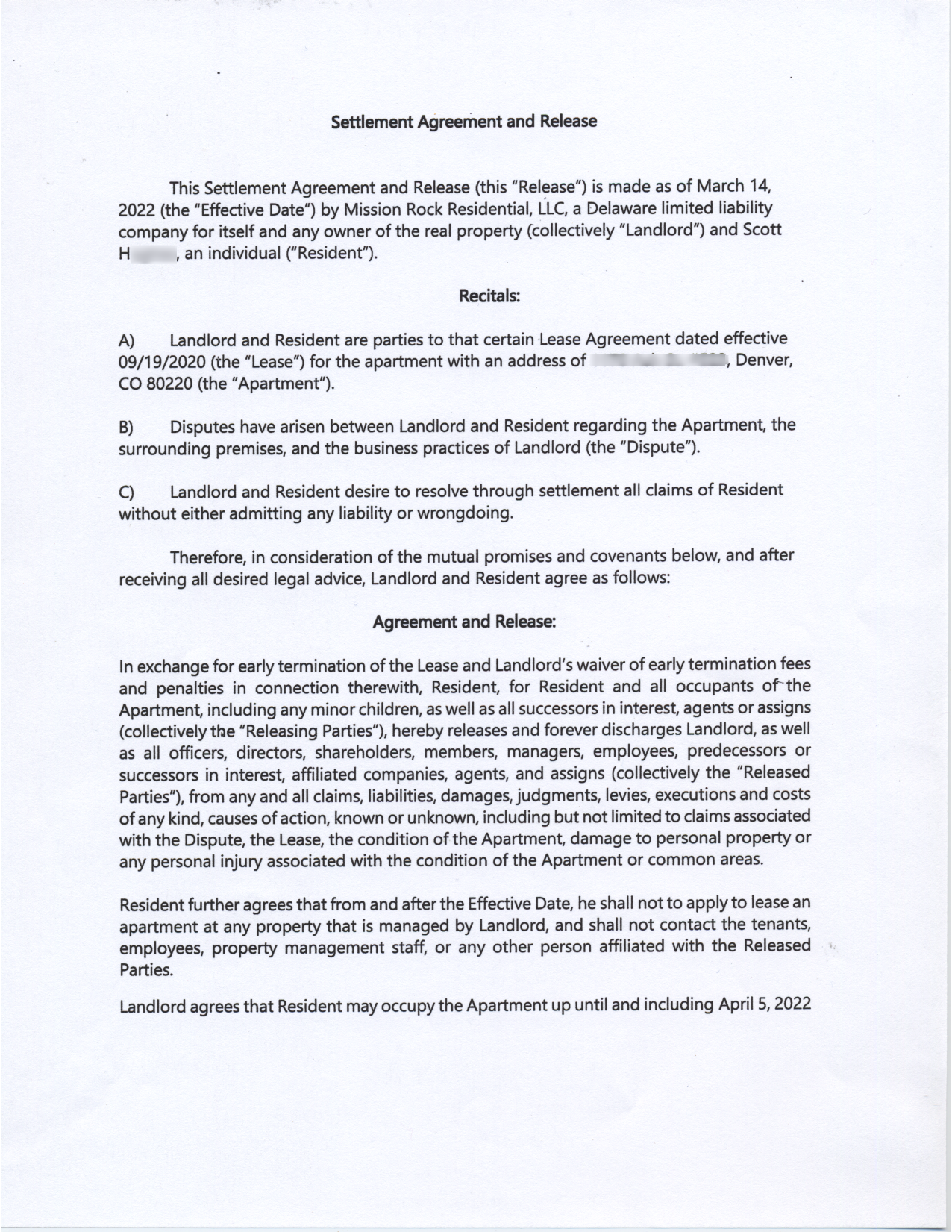 This Settlement Agreement and Release (this “Release”) is made as of March 14, 2022 (the “Effective Date”) by Mission Rock Residential, LLC, a Delaware limited liability company for itself and any owner of the real property (collectively “Landlord”) and Scott H , an individual (“Resident”).